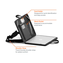 Enhance your laptop experience with our shock-absorbent softshell case. Designed for quick access and style, it protects your laptop from debris. Interior mesh pockets and straps keep your device secure, ensuring easy retrieval. Featuring a shoulder strap and convenient handles for effortless commuting.