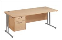 Maestro 25 straight desk 1400mm x 800mm with 2 drawer pedestal - silver cantilever leg frame, beech top
